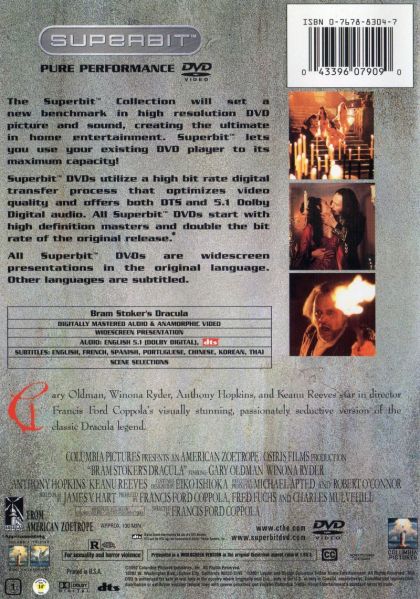 The anamorphically enhanced Superbit 1.85:1 DVD is not a new transfer, so improvements over the previously released DVD are often subtle. While viewing the movie, the picture appears to have slightly improved overall clarity. However, under close scrutiny, fine details like the gold embroidered emblem on Dracula’s blood red robe (13:55) is perfectly defined on the Superbit version, while on the previous DVD, the emblem is considerably smeared. Still, even on the Superbit DVD, there are some scenes with softly focused images. Both versions exhibit excellent color fidelity, with nicely rendered fleshtones, rich hues, and endless blacks. The source element is revealing of some dirt, artifacts, and film grain. Edge enhancement is generally not a problem for either version, but details shimmer slightly on occasion. (Suzanne Hodges)