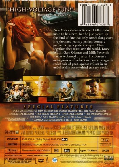 Appearing identical to the previously released Superbit™ DVD (reviewed in Issue 54), The Fifth Element continues to stand as one title that has prevailed over the years as a reference quality DVD. This Superbit DVD picture (framed at 2.35:1) utilizes a higher bit rate than the first DVD release, with slightly noticeable improvements in details and clarity. Colors are still rich and vibrant, with deep pure blacks, and natural fleshtones. Images are sharp and finely detailed, with superb definition, contrast, and shadow delineation. Distractions in the way of pixelization and edge enhancement are virtually undetectable. (Suzanne Hodges)