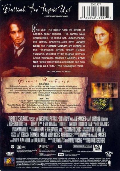 If you were living in England in the late 1880s, Whitechapel is not where you’d want to plan a family vacation. Why? Well, besides the weather, Jack the Ripper, the nefarious prostitute slasher “From Hell,” is reigning the streets. To calm the frazzled nerves of the usually stoic Londoners, Scotland Yard sends their top inspectors, Fred Abberline (Depp), who is gifted (or cursed) with second sight, and his partner (Coltrane) to end the terror...and end it quickly. During the course of the investigation, Abberline meets and falls for Mary Kelly (Graham), a beautiful Irish streetwalker with, obviously, questionable morals. But can she be saved before becoming the next victim? Based on the graphic novel by Alan Moore and Eddie Campbell. (Jack Kelley)