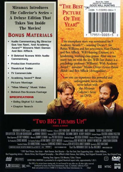 Winner of three Academy Awards®, including Best Original Screenplay for Ben Affleck and Matt Damon, Good Will Hunting is the tale of a misunderstood genius named Will Hunting (Damon). Thwarted by personal anger, Will’s hope lies with Sean McQuire (Best Supporting Actor Oscar®-winner, Robin Williams), a patient and understanding college therapist.