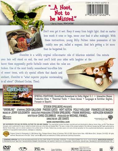 The remixed Dolby® Digital soundtrack exhibits a nicely recorded music score with a terrific and expansive soundstage that wraps into the surrounds. The sound design effectively uses the split surround pallette for Gremlin sound effects. Dialogue is sometimes chesty or ADR-”manufactured,” but generally sounds spatially integrated. Overall, this is a well produced soundtrack that is sure to please with wonderful spatial qualities.