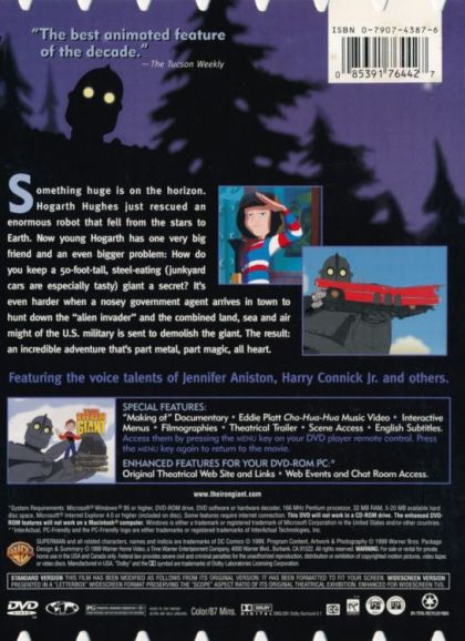 Based on the book by Ted Hughes, The Iron Giant is an exciting yet gentle tale for young children about a boy who discovers a 50-foot-tall steel-eating giant from outer space. Hogarth Hughes (voiced by Eli Marienthal) tries to keep his new friend a secret from the government agents who have arrived in town to investigate some mysterious events. The Warner Bros. animation effort was nominated for 15 ‘Annie’ awards and received nine statues: Best Picture, Director, Writing, Voice Acting (Marienthal), Music, Character Animation, Effects Animation, Production Design and Storyboarding. Annie awards are sponsored by the Hollywood branch of the International Animated Film Society and were started 27 years ago by June Foray - most noted as the voice of Rocky The Flying Squirrel in the classic Jay Ward television show.