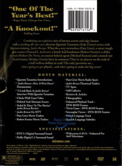Jackie Brown is a flight attendant who gets caught in the middle of smuggling cash into the country for her gunrunner boss. When the cops try to use Jackie to get to her boss, she hatches a plan—with help from a bail bondsman—to keep the money for herself. Based on Elmore Leonard's novel "Rum Punch."