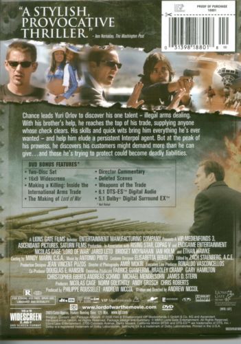 Yuri Orlov is a globetrotting arms dealer. Through some of the deadliest war zones, Yuri struggles to stay one step ahead of a relentless Interpol agent, his business rivals, even some of his customers who include many of the world's most notorious dictators. Finally, Yuri must also face his own conscience.