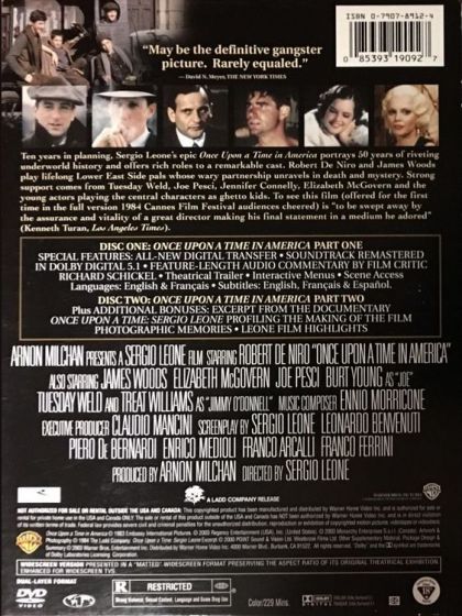 "Once Upon A Time In America" is Sergio Leone’s acclaimed gangster epic based on the novel "The Hoods" by Harry Grey, presented here in the original 229-minute edition. The story portrays 50 years of riveting underworld history and provides rich roles for a remarkable cast headed by Robert De Niro and James Woods as Noodles and Max, friends since their turn-of-the-century ghetto childhood and partners in a criminal empire during Prohibition. The story is told through a series of flashbacks, which depict their transition from young neighborhood friends who vow to stick together in their life of crime in turn-of-the-century New York City. "Once Upon A Time In America" was the final film of Sergio Leone’s illustrious career. (Gary Reber)