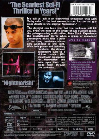 When mechanical failures cause the crash landing of a spaceship on an abandoned planet, the surviving passengers-including a policeman (Hauser) and his prisoner (Diesel)-must learn to adjust to the harsh realities of their new home. This planet has three suns and no night, but every few years there is a total eclipse, and that’s when the scary bad guys come up from under ground and devour everyone in sight. The prisoner-a convicted murderer-suddenly comes to their rescue to lead the group back to their ship away from the scary guys because he has these really freaky eyes with which he can see even when it’s Pitch Black. (Laurie Sevano)