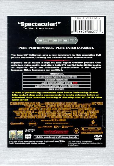 The anamorphically enhanced 1.85:1 Superbit DVD exhibits subtle improvements over the nicely rendered previously released DVD. Images can be sharp and finely detailed, though sometimes seeming softly focused. The Umbrella Corporation digital graphics have finer edges than the non-Superbit title. Colors are rich and nicely balanced, with accurate fleshtones and deep blacks. Contrast is nicely rendered and, with much of the picture taking place in dimly lit settings, shadow delineation is suitable for the storytelling. There is some edge enhancement noticed, and pixelization is occasionally detected. (Suzanne Hodges)