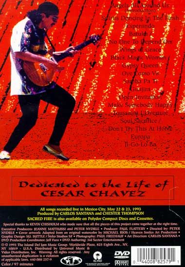 Sacred Fire: Live in South America is an album by Santana. This album is dedicated to the life of Cesar Chavez. There is also a video of this album, by the same name, featuring additional songs not featured on the album. It features shots of Carlos playing guitar at various historic sites around Mexico city.