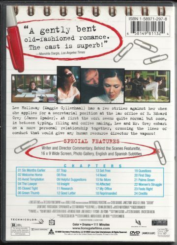 After spending time in a mental institution, Lee Holloway (Gyllenhaal) is sent home to live with her parents, an overprotective mother (Warren) and an alcoholic father (McHattie). Wanting to take care of herself, Lee applies for and gets a job as a "Secretary" working for E. Edward Grey (Spader), an attorney who warns her that she is overqualified for the job and will most likely be bored. Excited about her job she works hard and does whatever her boss asks of her, and when Edward starts abusing Lee and inflicting pain on her she revels in her new position. After realizing what she needs to be satisfied, Lee trys to get her boyfriend Peter (Davies) to be rough with her but he won't do it and can't give her what she craves. Furthermore, after her boss realizes that Lee enjoys the abuse, it no longer excites him and he fires her, much to her dismay. But Lee will stop at nothing to get what and whom she wants... no matter what she has to do to get it! Based on the story "Secretary" By Mary Gaitskill. (Tricia Littrell)