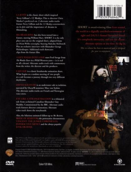 Synopsis: Short #2 (previously released as "Short Cinema Journal #1.2") has been remastered and redesigned exclusively for this DVD release. The "Dreams" issue includes "La Jetee," the short that inspired Terry Gilliam's "12 Monkeys," in director Chris Marker's preferred cut. "The Big Brass Ring" has also been turned into a feature, starring William Hurt; "Short 2" is the only place you can see the original short, adapted from an Orson Welles screenplay and starring Malcolm McDowell. Remember little Fred Savage from "The Wonder Years?" He's all grown up--drinking, swearing and doing a nude love scene in "A Guy Walks into a Bar." Other films include Max von Sydow narrating the underwater marvel "Depth Solitude;" "The Eye Like a Strange Balloon" by cult Canadian director Guy Maddin; "Cafe Bar," an animation classic from Alison de Vere of the Beatles' "Yellow Submarine" fame; and much much more.