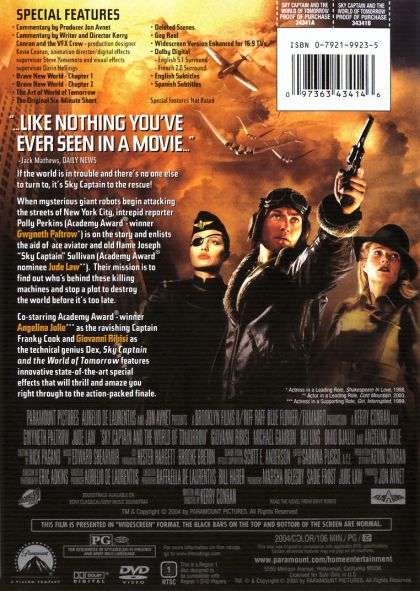 When six scientists are missing and feared dead, reporter Polly Perkins (Paltrow) is on the case. And after giant robots invade the city, Joe "Sky Captain" (Law) is called on to save the day. Polly pays a visit to Joe, who at first wants nothing to do with her, asking him to join forces. Their mission is to save the scientists "And" the planet before it's too late. Can it be done or will the evil Dr. Totenkopf (Olivier) destroy "The World Of Tomorrow" once and for all? (Tricia Littrell)