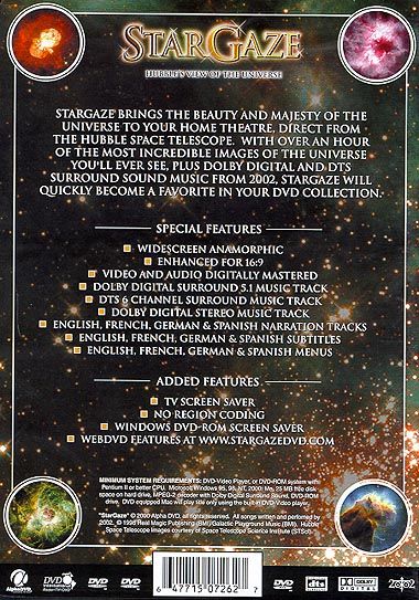 Stargaze brings the beauty and majesty of the universe to your home theatre, direct from the Hubble space telescope. With over an hour of the most incredible images of the universe you'll ever see, plus dolby digital and DTS surround sound music from 2002, Stargaze will quickly become a favorite in you DVD collection.