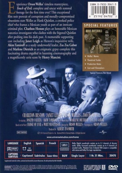 Based on the novel Badge Of Evil by Whit Masterson, this version of Touch Of Evil (produced by Rick Schmidlin and edited by Walter Murch) is an attempt at reediting the theatrically released version (edited by Universal Pictures) to what writer/director/star Orson Welles originally intended based on his 58-page memo (that’s included in the special features). The story involves a corrupt American police chief (Welles), a Mexican narcotics investigator (Heston) and his inquisitive wife (played deliciously by Janet Leigh). (Laurie Sevano)