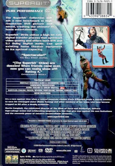 The Dolby® Digital 5.1-channel soundtrack is the same as that issued previously. The DTS® Digital Surround™ audio offers some subtle, yet noticeable refinements to what is already an excellent soundtrack, including a little greater punch in the low-end, and a soundstage that seems slightly more open and resolute. A good example of the latter is with the sounds of snow and ice pellets falling all around in Chapter 22. The audio presentations are truly outstanding demonstrations of dynamics and dimension. The soundtrack (originally created for 8-channel SDDS®) was rerecorded on the William Holden Stage at the Sony Pictures Studios lot by Bob Beemer and Scott Millan (Oscar® winners for Gladiator), and the supervising sound editor is credited to Dave McMoyler. The surrounds fully come alive, and often prominently, with very effective utilization of left-right separation that, along with the screen channels, dramatically opens up the listening space and at the same time fully absorbs the listener, such as in Chapter 9 with the fierce blizzard and subsequent avalanche. Another very dramatic example is in Chapter 16, with the helicopter drop-off scene, as the soundstage becomes fully energized. But it is also the moderate spread of ambient and specific effects throughout the soundfield that are commendable. The back surround channel should certainly provide for a noticeable enhancement in the surround soundstage. In addition to the excellent use of dimension throughout, this sound mix is also notable in terms of the creativity with sound effects. Foley, in particular, is remarkable with the sounds of footsteps in the snow, the handling of climbing-related gear, and the like very well recorded and reproduced in the sound mix with remarkable poignancy, such as in the snow-laced cavern which has trapped the climbers. And, of course the use of the low-end is both remarkable and downright exciting. All channels will experience sub-25 Hz bass extension, sometimes with enough sheer intensity to challenge your system for the avalanches and explosions. The .1 LFE is also a prominent factor for this soundtrack, both with effects and the music. The music has a very nicely enveloping, rich presence that is pleasing and engaging to experience, and also very effectively heightens the visceral settings. Voices are delivered with very good fidelity, but also with a somewhat forward-sounding presence with some mid-bass emphasis, attributes which somewhat compromise naturalness in terms of spatial integration. (Perry Sun)