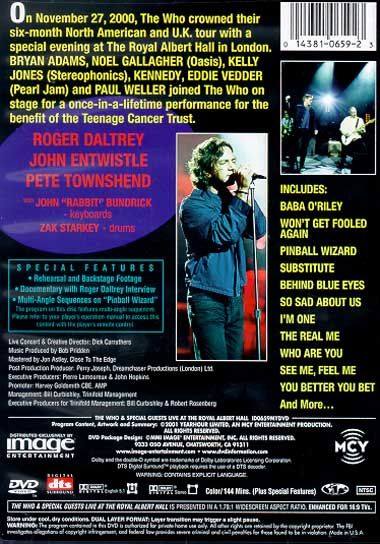 The Who & Special Guests: Live at the Royal Albert Hall is a concert film of The Who's concert on November 27, 2000 at the Royal Albert Hall in London to benefit the Teenage Cancer Trust. Bryan Adams, Noel Gallagher (Oasis), Kelly Jones (Stereophonics), Kennedy, Eddie Vedder (Pearl Jam) and Paul Weller joined the Who on stage for a once-in-a-lifetime performance. The concert was also released on CD as Live at the Royal Albert Hall.