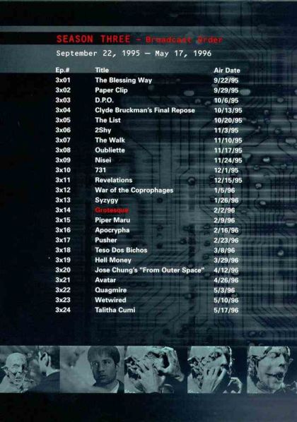 Scully recounts the investigation of an alleged UFO encounter for the famous quirky author Jose Chung's latest novel. The case gives a whole new meaning to the term Rashomon effect. Chung later returns in Jose Chung's 'Doomsday Defense' (1997).