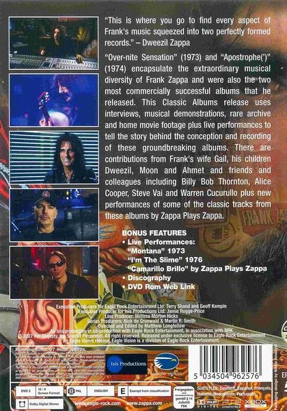 This episode focuses on Zappa's early 70s albums, Overnight Sensation (1973) and Apostrophy (') (1974). Together they encapsulate Zappa's extraordinary musical diversity and were also the 2 most commercially successful albums that he released in his prolific career. Included are interviews, musical demonstrations, rare archive & home movie footage, plus live performances to tell the story behind the conception and recording of these groundbreaking albums. Extras include additional interviews and demonstrations not included in the broadcast version, 2 full performances from the Roxy in 1973 and Saturday Night Live in 1976, and new full live performance done specially for these Classic Albums.