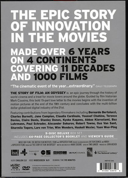 The Story of Film: An Odyssey, written and directed by award-winning film-maker Mark Cousins, is the story of international cinema told through the history of cinematic innovation. Five years in the making, The Story of Film: An Odyssey covers six continents and 12 decades, showing how film-makers are influenced both by the historical events of their times, and by each other. It provides a worldwide guided tour of the greatest movies ever made; an epic tale that starts in nickelodeons and ends as a multi-billion-dollar globalised digital industry. Described as a love letter to the movies, Cousins visits the key sites in the history of cinema; from Hollywood to Mumbai; from Hitchcock s London to the village where Pather Panchali was shot, and features interviews with legendary filmmakers and actors including Stanley Donen, Kyoko Kagawa, Gus van Sant, Lars Von Trier, Claire Denis, Bernardo Bertolucci, Robert Towne, Jane Campion and Claudia Cardinale.