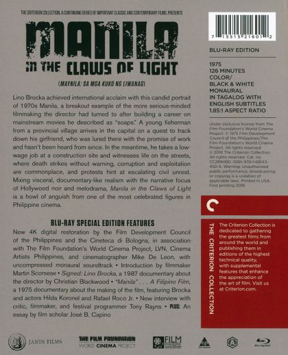 New 4K digital restoration by the Film Development Council of the Philippines and the Cineteca di Bologna, in association with The Film Foundation’s World Cinema Project, LVN, Cinema Artists Philippines, and cinematographer Mike De Leon, with uncompressed monaural soundtrack on the Blu-ray