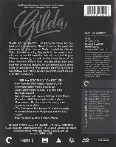 Just arrived in Argentina, small-time crooked gambler Johnny Farrell is saved from a gunman by sinister Ballin Mundson, who later makes Johnny his right-hand man. But their friendship based on mutual lack of scruples is strained when Mundson returns from a trip with a wife: the supremely desirable Gilda, whom Johnny once knew and learned to hate. The relationship of Johnny and Gilda, a battlefield of warring emotions, becomes even more bizarre after Mundson disappears...