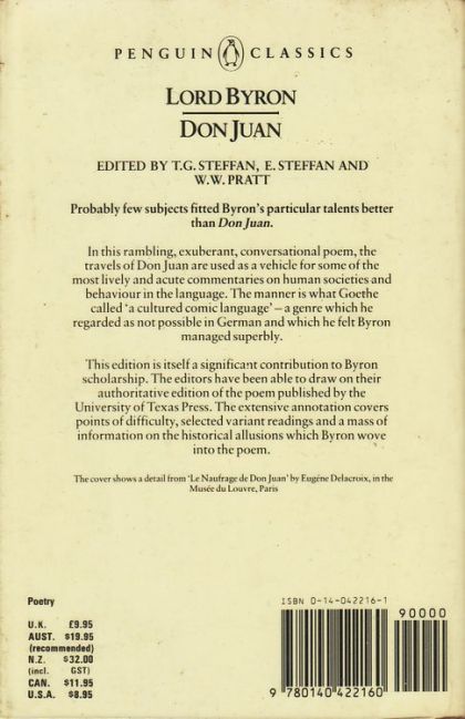 In this rambling, exuberant, conversational poem, the travels of Don Juan are used as a vehicle for some of the most lively and acute commentaries on human societies and behaviour in the language. The manner is what Goethe called 'a cultured comic language' - a genre which he regarded as not possible in German and which he felt Byron managed superbly. This edition is itself a significant contribution to Byron scholarship. The editors have been able to draw on their authoritative edition of the poem published by the University of Texas Press. The extensive annotation covers points of difficulty, selected variant readings and a mass of information on the historical allusions which Byron wove into the poem. Book jacket.