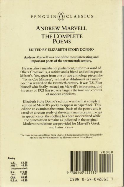 Andrew Marvell was one of the most interesting and important poets of the seventeenth century. He was also a member of parliament, tutor to a ward of Oliver Cromwell's, a satirist and a friend and colleague of Milton's. Yet, apart from one or two anthology pieces like 'To his Coy Mistress', his final establishment as a major poet has waited on the twentieth century. It was T.S. Eliot himself who finally insisted on Marvell's importance, and his essay of 1921 has set very largely the tone and context of modern criticisms. Elizabeth Story Donno's edition was the first complete edition of Marvell's poetry to appear in paperback. This edition re-examines the textual basis of the poetry and is based on a recent study of the extant manuscripts. Except in special cases, the spelling has been modernized while the punctuation remains as indicated in the original. Modern translations are provided for Marvell's Greek and Latin poems.