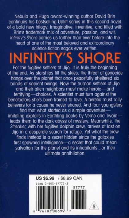 Nebula and Hugo award-winning author David Brin continues his bestselling Uplift series in this second novel of a bold new trilogy. Imaginative, inventive, and filled with Brin's trademark mix of adventure, passion, and wit, Infinity's Shore carries us further than ever before into the heart of the most beloved and extraordinary science fiction sagas ever written. For the fugitive settlers of Jijo, it is truly the beginning of the end. As starships fill the skies, the threat of genocide hangs over the planet that once peacefully sheltered six bands of sapient beings. Now the human settlers of Jijo and their alien neighbors must make heroic--and terrifying--choices. A scientist must rally believers for a cause he never shared. And four youngsters find that what started as a simple adventure--imitating exploits in Earthling books by Verne and Twain--leads them to the dark abyss of mystery. Meanwhile, the Streaker, with her fugitive dolphin crew, arrives at last on Jijo in a desperate search for refuge. Yet what the crew finds instead is a secret hidden since the galaxies first spawned intelligence--a secret that could mean salvation for the planet and its inhabitants...or their ultimate annihilation.