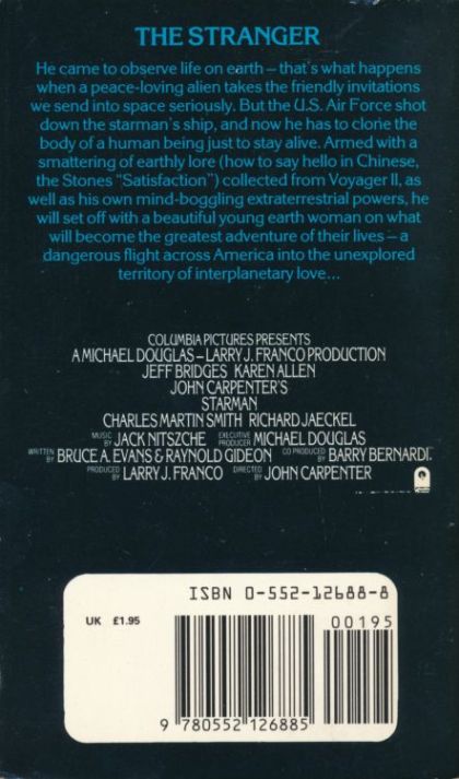 He came to observe life on earth - that's what happens when a peace-loving alien takes the friendly invitations we send into space seriously. But the U.S. Air Force shot down the starman's ship, and now he has to clone the body of a human being just to stay alive. Armed with a smattering of earthly lore (how to say hello in Chinese,the Stones "Satisfaction") collected from Voyager 11, as well as his own mind-boggling extraterrestrial powers, he will set off with a beautiful young earth woman on what will become the greatest adventure of their lives - a dangerous flight across America into the unexplored territory of interplanetary love...