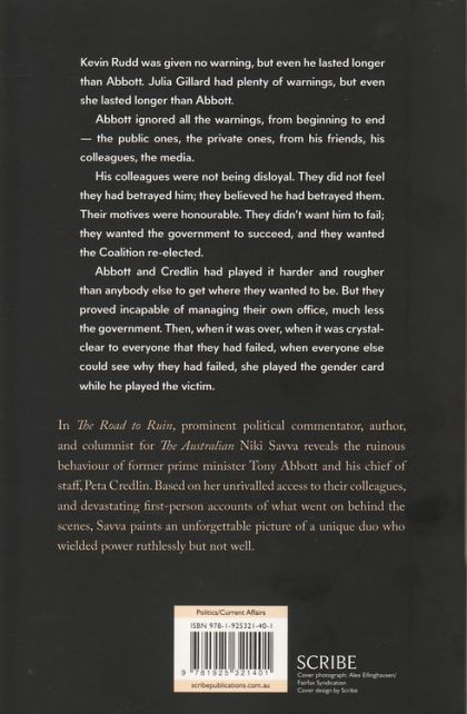 Kevin Rudd was given no warning, but even he lasted longer than Abbott. Julia Gillard had plenty of warnings, but even she lasted longer than Abbott. Abbott ignored all the warnings, from beginning to end -- the public ones, the private ones, from his friends, his colleagues, the media. His colleagues were not being disloyal. They did not feel they had betrayed him; they believed he had betrayed them. Their motives were honourable. They didn't want him to fail; they wanted the government to succeed, and they wanted the Coalition re-elected. Abbott and Credlin had played it harder and rougher than anybody else to get where they wanted to be. But they proved incapable of managing their own office, much less the government. Then, when it was over, when it was crystal-clear to everyone that they had failed, when everyone else could see why they had failed, she played the gender card while he played the victim. In The Road to Ruin, prominent political commentator, author, and columnist for The Australian Niki Savva reveals the ruinous behaviour of former prime minister Tony Abbott and his chief of staff, Peta Credlin. Based on her unrivalled access to their colleagues, and devastating first-person accounts of what went on behind the scenes, Savva paints an unforgettable picture of a unique duo who wielded power ruthlessly but not well.