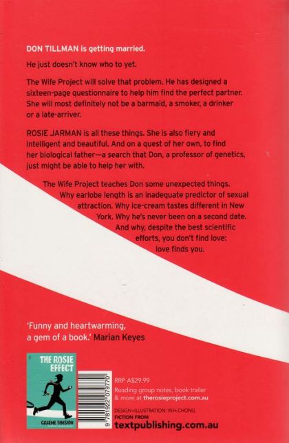 The feel-good novel of 2013, The Rosie Project is a classic screwball romance. Rights sold into more than forty countries. Don Tillman is getting married. He just doesn’t know who to yet. But he has designed the Wife Project, using a sixteen-page questionnaire to help him find the perfect partner. She will most definitely not be a barmaid, a smoker, a drinker, or a late-arriver. Rosie Jarman is all these things. She is also fiery and intelligent and beautiful. And on a quest of her own to find her biological father—a search that Don, a professor of genetics, might just be able to help her with. The Wife Project teaches Don some unexpected things. Why earlobe length is an inadequate predictor of sexual attraction. Why quick-dry clothes aren’t appropriate attire in New York. Why he’s never been on a second date. And why, despite your best scientific efforts, you don’t find love: love finds you.