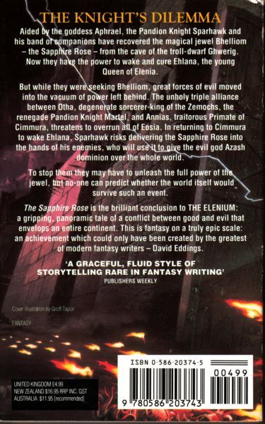 Third of the series Elenium is fantasy on a truly epic scale, in which the Pandion Knight Sparhawk must finally use the power of the jewel. Aided by the goddess Aphrael, Sparhawk and his band of companions have recovered the magical jewel Bhelliom-the Sapphire Rose- from the cave of the troll-dwarf Ghwerig. Now they have the power to wake and cure Ehlana, the young Queen of Elenia. But while they were seeking Bhelliom, great forces of evil moved into the power vacuum left behind. The unholy triple alliance between Otha, degenerate sorcerer-king of the Zemochs, the renegade Pandion Knight Martel, and Annias, traitorous Primate of Cimmura, threatens to overrun all of Eosia. In returning to Cimmura to wake Ehlana, Sparhawk risks delivering the Sapphire Rose into the hands of his enemies, who will use it to give the evil god Azash dominion over the whole world. To stop them they may have to unleash the full power of the jewel, but no one can predict whether the world itself will survive such an event. The story is the gripping, brilliant conclusion to the series, a panoramic tale of a conflict between good and evil that envelops an entire continent.