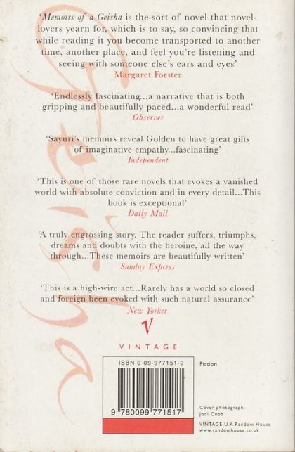 Nitta Sayuri tells the story of her life as a geisha. In Memoirs of a Geisha, we enter a world where appearances are paramount; where a girl's virginity is auctioned to the highest bidder; where women are trained to beguile the most powerful men; and where love is scorned as illusion. Sayuri's story begins in a poor fishing village in 1929, when, as a nine-year-old with unusual blue-gray eyes, she is taken from her home and sold into slavery to a renowned geisha house. Through her eyes, we see the decadent heart of Gion - the geisha district of Kyoto - with its marvelous teahouses and theaters, narrow back alleys, ornate temples, and artists' streets. And we witness her transformation as she learns the rigorous arts of the geisha: dance and music; wearing kimono, elaborate makeup and hair; competing with a jealous rival for men's solicitude and the money that goes with it. But as World War II erupts and the geisha houses are forced to close, Sayuri, with little money and even less food, must reinvent herself all over again to find a rare kind of freedom on her own terms.