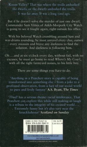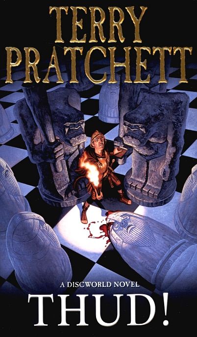A seemingly routine day in the life of City Watch commander Sam Vimes is abruptly interrupted by an unsolved murder, an impending war, an unwanted new recruit, and a pesky government inspector. By the author of Going Postal. It's a game of Trolls and Dwarfs where the player must take both sides to win. It's the noise a troll club makes when crushing in a dwarf skull, or when a dwarfish axe cleaves a trollish cranium. It's the unsettling sound of history about to repeat itself. THUD! It's the most extraordinary, outrageous, provocative, insightful, and keenly cutting flight of fancy yet from Discworld's incomparable supreme creator, Terry Pratchett. Commander Sam Vimes of the Ankh-Morpork City Watch admits he may not be the sharpest knife in the cutlery drawer. He might not even be a spoon.