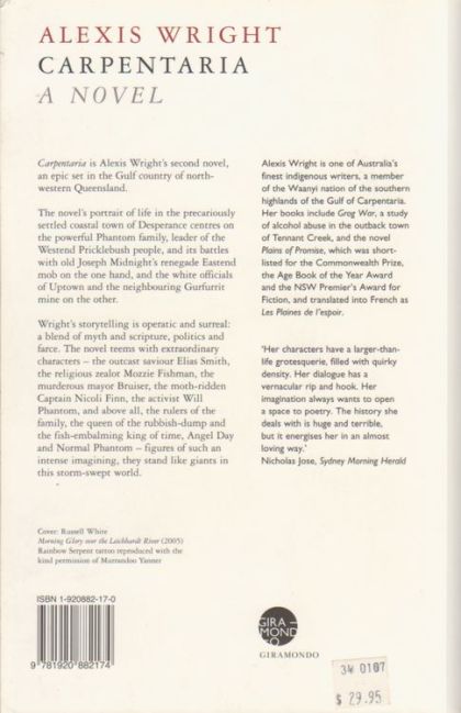 Carpentaria is Alexis Wright's second novel, an epic set in the Gulf country of northwestern Queensland. The novel's portrait of life in the precariously settled coastal town of Desperance centres on the powerful Phantom family, leader of the Westend Pricklebush people, and its battles with old Joseph Midnight's renegade Eastend mob on the one hand, and the white officials of Uptown and the neighbouring Gurfurrit mine on the other. Wright's storytelling is operatic and surreal: a blend of myth and scripture, politics and farce. The novel teems with extraordinary characters - the outcast saviour Elias Smith, the religious zealot Mozzie Fishman, the murderous mayor Bruiser, the moth-ridden Captain Nicoli Finn, the activist Will Phantom, and above all, the rulers of the family, the queen of the rubbish-dump and the fish-embalming king of time, Angel Day and Normal Phantom - figures of such an intense imagining, they stand like giants in this storm-swept world....