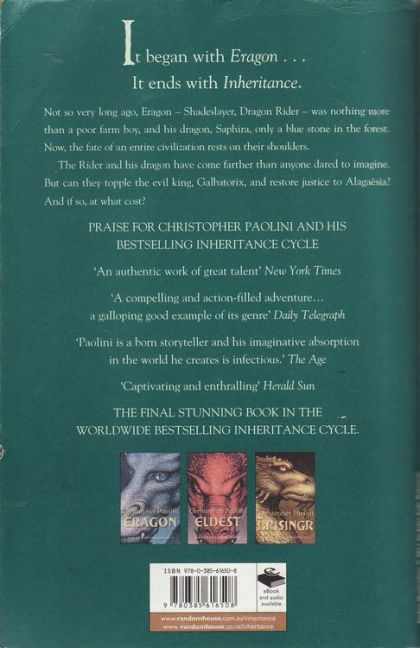 Not so very long ago, Eragon - Shadeslayer, Dragon Rider - was nothing more than a poor farm boy, and his dragon, Saphira, only a blue stone in the forest. Now, the fate of an entire civilization rests on their shoulders. Long months of training and battle have brought victories and hope, but they have also brought heartbreaking loss. And still, the real battle lies ahead: they must confront Galbatorix. When they do, they will have to be strong enough to defeat him. And if they cannot, no one can. There will be no second chances. The Rider and his dragon have come farther than anyone dared to hope. But can they topple the evil king and restore justice to Alagaesia? And if so, at what cost?