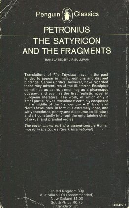 Translations of The Satyricon have in the past tended to appear in limited editions and discreet bindings. Serious critics, however, have regarded these racy adventures of the ill-starred Encolpius sometimes a satire, sometimes as a picaresque odyssey, and even as the first realistic novel in European literature. The work, of which only a small part survives, was almost certainly composed in the middle of the first century A.D. by one of Nero's favorites. In form it is extremely loose, and witty anecdotes, poetry, and discourse on literature and art constantly interrupt the entertaining chain of sexual and prandial orgies. The cover shows part of a second-century Roman mosaic in the Louvre. --book jacket *Petronius* d. c..AD 66, Roman satirist, known as Petronius Arbiter because of his now generally accepted identity with Gaius Petronius, to whom Tacitus refers as arbiter elegantiae in the court of Nero. According to Tacitus, Petronius served first a proconsul, then as consul of Bithynia. He is remembered chiefly, however, as an indolent and profligate lover of luxury. When Tigellinus, a rival for the favor of Nero, caused the arrest of Petronius, the latter ended his own life, at Cumae, by slashing his veins. He made dying a leisurely procedure, attended by festivity among his associates. To him is accredited the authorship of a satirical work, Petronii arbitri satyricon, a romance with skillful delineation of characters, written in prose interspersed with verse. Parts of the 15th and 16th books have been preserved. Among the surviving fragments the most complete and valuable section is the Cena Trimalchionis (Trimalchio's Dinner), presenting a humorous episode of vulgar display on the part of a man whose great wealth is newly acquired. These satires furnish a vivid study of the life and manners of the time in a sustained, connected example of the colloquial language. The Latin style of Petronius is among the best of its period. --encyclopedia.com