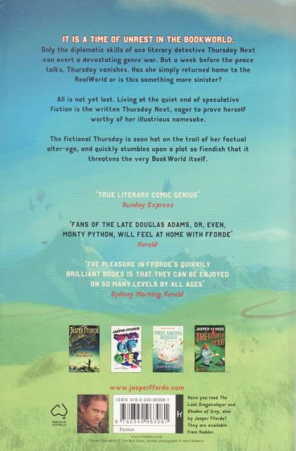 It is a time of unrest in the BookWorld. Only the diplomatic skills of ace literary detective Thursday Next can avert a devastating genre war. But a week before the peace talks, Thursday vanishes. Has she simply returned home to the RealWorld or is this something more sinister? All is not yet lost. Living at the quiet end of speculative fictionis the written Thursday Next, eager to prove herself worthy of her illustrious namesake. The fictional Thursday is soon hot on the trail of her factual alter-ego, and quickly stumbles upon a plot so fiendish that it threatens the very BookWorld itself. -- Back cover.