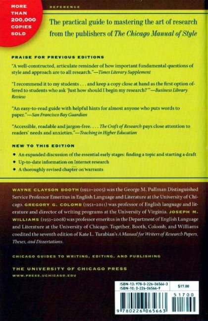 With more than 400,000 copies now in print, The Craft of Research is the unrivaled resource for researchers at every level, from first-year undergraduates to research reporters at corporations and government offices. Seasoned researchers and educators Gregory G. Colomb and Joseph M. Williams present an updated third edition of their classic handbook, whose first and second editions were written in collaboration with the late Wayne C. Booth. The Craft of Research explains how to build an argument that motivates readers to accept a claim; how to anticipate the reservations of readers and to respond to them appropriately; and how to create introductions and conclusions that answer that most demanding question, “So what?” The third edition includes an expanded discussion of the essential early stages of a research task: planning and drafting a paper. The authors have revised and fully updated their section on electronic research, emphasizing the need to distinguish between trustworthy sources (such as those found in libraries) and less reliable sources found with a quick Web search. A chapter on warrants has also been thoroughly reviewed to make this difficult subject easier for researchers Throughout, the authors have preserved the amiable tone, the reliable voice, and the sense of directness that have made this book indispensable for anyone undertaking a research project.