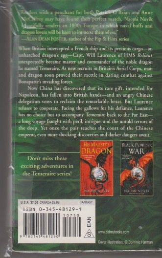 When Britain intercepted a French ship and its precious cargo–an unhatched dragon’s egg–Capt. Will Laurence of HMS Reliant unexpectedly became master and commander of the noble dragon he named Temeraire. As new recruits in Britain’s Aerial Corps, man and dragon soon proved their mettle in daring combat against Bonaparte’s invading forces. Now China has discovered that its rare gift, intended for Napoleon, has fallen into British hands–and an angry Chinese delegation vows to reclaim the remarkable beast. But Laurence refuses to cooperate. Facing the gallows for his defiance, Laurence has no choice but to accompany Temeraire back to the Far East–a long voyage fraught with peril, intrigue, and the untold terrors of the deep. Yet once the pair reaches the court of the Chinese emperor, even more shocking discoveries and darker dangers await.