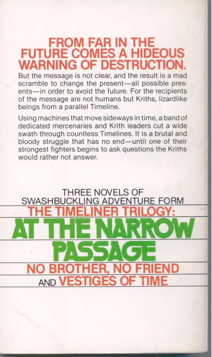 From far in the future comes a hideous warning of destruction. But the message is not clear, and the result is a mad scramble to change the present -- all possible presents -- in order to avoid the future. For the recipients of the message are not humans but Kirths, lizardlike beings from a parallel Timeline. Using machines that move sideways in time, a band of dedicated mercenaries and Kirth leaders cut a wide swath through countless Timelines. It is a brutal and bloody struggle that has no end -- until one of their strongest fighters begins to ask questions the Kirths would rather not answer.