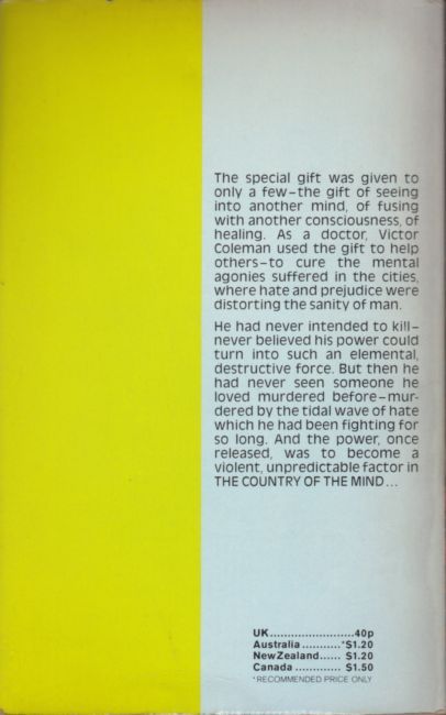The special gift was given to only a few - the gift of seeing into another mind, of fusing with another consciousness, of healing. As a doctor, Victor Coleman used the gift to help others - to cure the mental agonies suffered in the cities, where hate and prejudice were distorting the sanity of man. He had never intended to kill - never believed his power could turn into such an elemental, destructive force. But then he had never seen someone he loved murdered before - murdered by the tidal wave of hate which he had been fighting for so long. And the power, once released, was to become a violent, unpredictable factor in THE COUNTRY OF THE MIND...