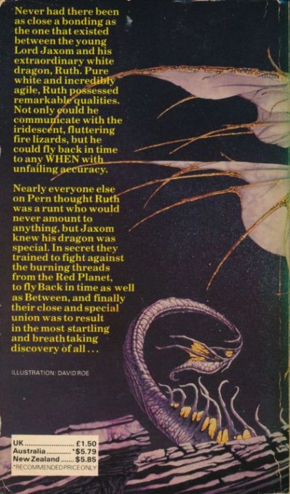 Never had there been as close a bonding as the one that existed between the young Lord Jaxom and his extraordinary white dragon, Ruth. Pure white and incredibly agile, Ruth possessed remarkable qualities. Not only could he communicate with the iridescent, fluttering fire lizards, but he could fly. Back in time to any WHEN with unfailing accuracy. Nearly everyone else on Pern thought Ruth was a runt who would never amount to anything, but Jaxom knew his dragon was special. In secret they trained to fight against the burning threads from the Red Planet, to fly Back in time as well as Between, and finally their close and special union was to result in the most startling and breathtaking discovery of all... THE WHITE DRAGON is one of the most unforgettable episodes in Anne McCaffrey's world-famous Chronicles of Pern.
