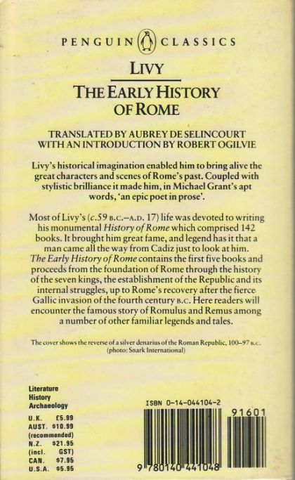With stylistic brilliance and historical imagination, the first five books of Livy's monumental history of Rome record events from the foundation of Rome through the history of the seven kings, the establishment of the Republic and its internal struggles, up to Rome's recovery after the fierce Gallic invasion of the fourth century bc. Livy vividly depicts the great characters, legends, and tales, including the story of Romulus and Remus. Reprinting Robert Ogilvie's lucid 1971 introduction, this highly regarded edition now boasts a new preface, examining the text in light of recent Livy scholarship, informative maps, bibliography, and an index. Translated by Aubrey de Sélincourt with an introduction by Robert Ogilvie.