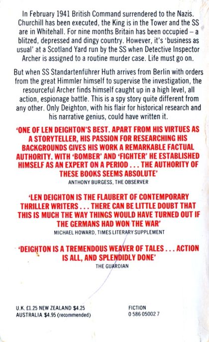 In February 1941 British Command surrendered to the Nazis. Churchill has been executed, the King is in the Tower and the SS are in Whitehall... For nine months Britain has been occupied - a blitzed, depressed and dingy country. However, it's 'business as usual' at Scotland Yard run by the SS when Detective Inspector Archer is assigned to a routine murder case. Life must go on. But when SS Standartenfuhrer Huth arrives from Berlin with orders from the great Himmler himself to supervise the investigation, the resourceful Archer finds himself caught up in a high level, all action, espionage battle. This is a spy story quite different from any other. Only Deighton, with his flair for historical research and his narrative genius, could have written it.