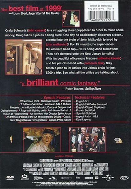 One day at work, unsuccessful puppeteer Craig finds a portal into the head of actor John Malkovich. The portal soon becomes a passion for anybody who enters its mad and controlling world of overtaking another human body.