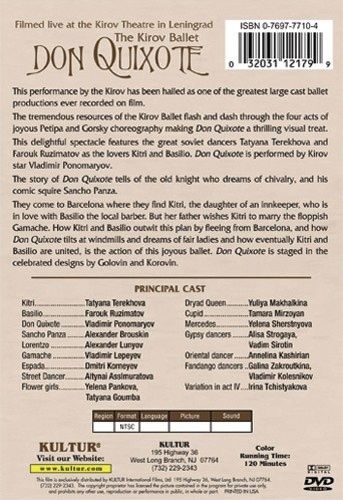 This performance by the Kirov has been hailed as one of the greatest large cast ballet productions ever recorded on film. The tremendous resources of the Kirov Ballet flash and dash through the four acts of joyous Petipa and Gorsky choreography making Don Quixote a thrilling visual treat. This delightful spectacle features the great Soviet dancers Tatyana Terekhova and Farouk Ruzimatov as the lovers Kitri and Basilio. Don Quixote is performed by the Kirov star Vladimir Ponomaryov.