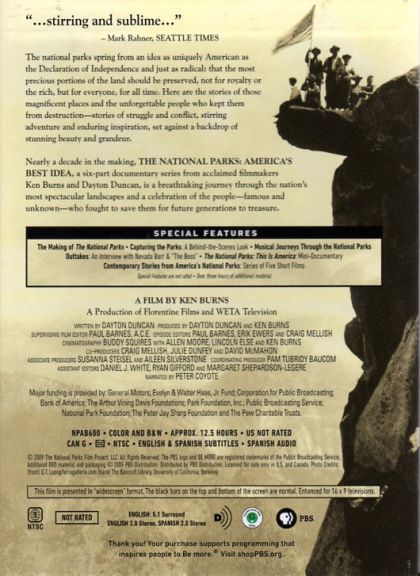 The National Parks: America's Best Idea is a six-episode series produced by Ken Burns and Dayton Duncan and written by Dayton Duncan. Filmed over the course of more than six years at some of nature's most spectacular locales – from Acadia to Yosemite, Yellowstone to the Grand Canyon, the Everglades of Florida to the Gates of the Arctic in Alaska - The National Parks: America's Best Idea is nonetheless a story of people: people from every conceivable background – rich and poor; famous and unknown; soldiers and scientists; natives and newcomers; idealists, artists and entrepreneurs; people who were willing to devote themselves to saving some precious portion of the land they loved, and in doing so reminded their fellow citizens of the full meaning of democracy. (PBS.org)