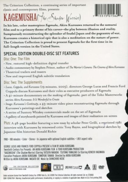 Akira Kurosawa's lauded feudal epic presents the tale of a petty thief who is recruited to impersonate Shingen, an aging warlord, in order to avoid attacks by competing clans. When Shingen dies, his generals reluctantly agree to have the impostor take over as the powerful ruler. He soon begins to appreciate life as Shingen, but his commitment to the role is tested when he must lead his troops into battle against the forces of a rival warlord.
