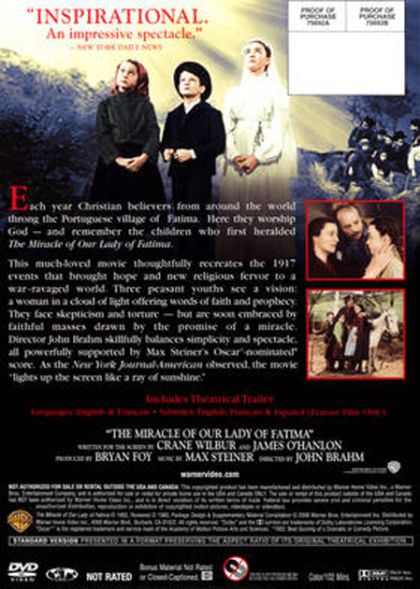 In 1917, three shepherd children living just outside Fatima, Portugal have visions of a lovely lady in a cloud. The anticlerical government wishes to squelch the Church; reports of religious experiences are cause for serious concern. Yet the children stand by their story, and the message of peace and hope the Lady brings. In the last vision, attended by thousands of people, the Lady proves her reality with a spectacular miracle that is seen by everyone present. Based on actual events at Fatima in the summer of 1917.