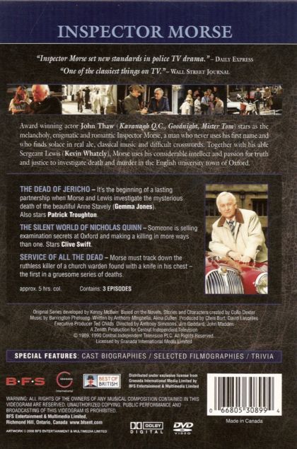 Award-winning actor John Thaw stars as the melancholy, enimatic and romantic Inspector Morse, a man who never uses his first name and who finds solace in real ale, classical music and difficult crosswords. Together with his able Sergeant Lewis, Morse uses his considerable intellect and passion for truth and justice to investigate death and murder in the English university town of Oxford.